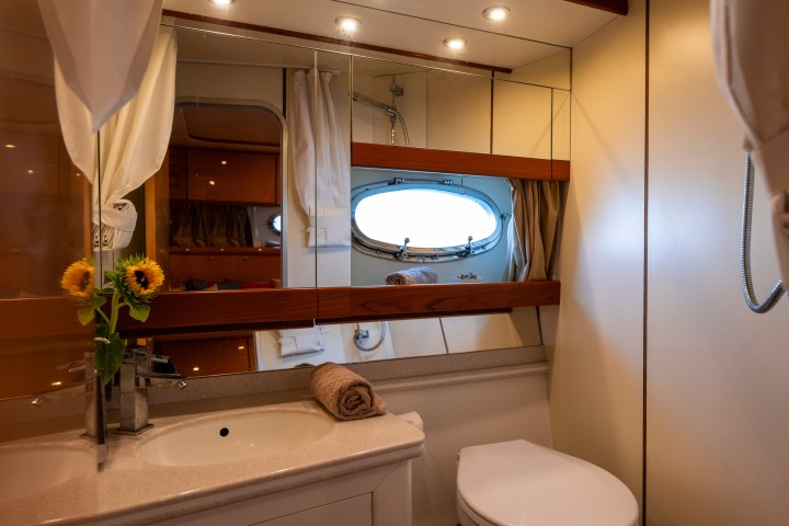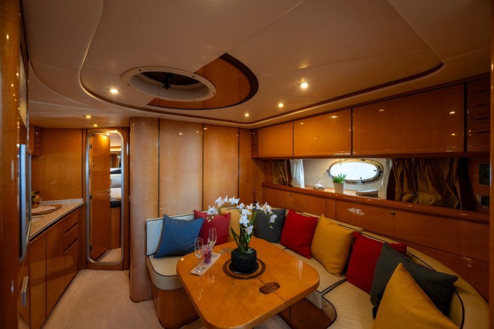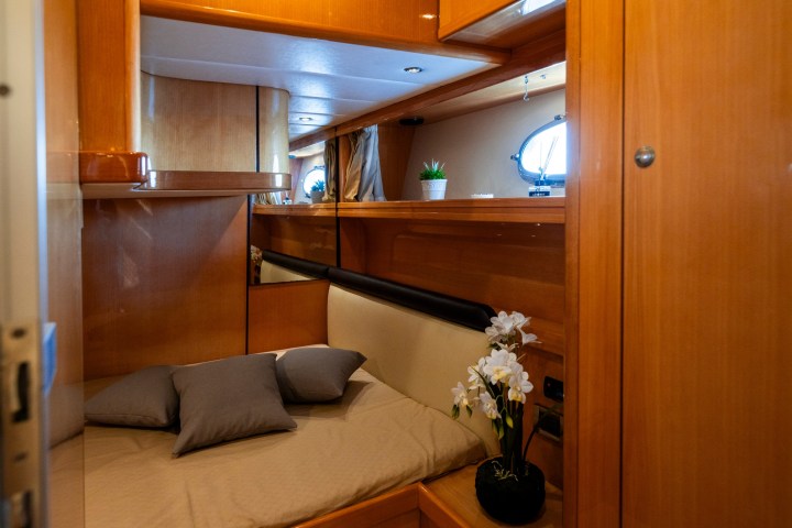 Our MAGNUM SUPREMUS 51 – Lady Rose offers separate and comfortable spaces, including: a fully equipped bathroom (hot water and hairdryer included); a living/kitchen area; it is perfect for accommodating and ensuring the comfort of a couple, with a master cabin with a sleeping area for two adults and a smaller cabin for the captain. Guests will have full access to all areas of the boat, both inside and out, including a sunbathing area.